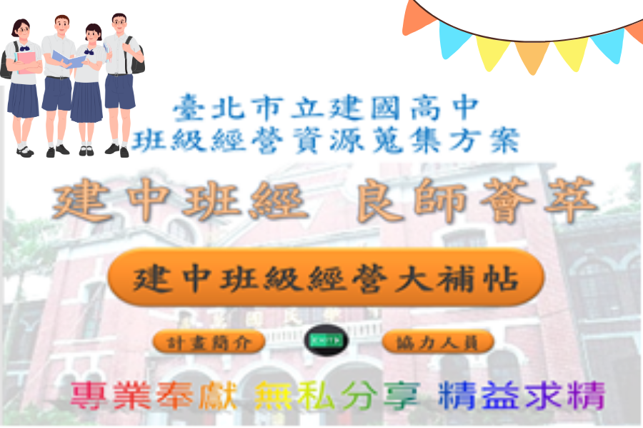 103學年度,筆者擔任級導師,依循「自發」、「互動」、「共好」的教育理念下,號召全校高一導師共同投入班級經營大補帖的募集與分享工作,歷經四個月(104年5月至同年8月)的彙整編撰,完成高一班級《班經薈萃》專輯,展現了初步成果。又再經歷兩年的醞釀與籌備,將高中三年的班經蒐集工作,經由期末輔導工作委員會及教務、學務兩處室的支持,邀集學校全體教師共襄盛舉,交織彼此專業,透過盤整回饋與精進創新班經歷程,於106年7月共同製作完成『建中班經良師薈萃』光碟(如圖1所示)。這段研發歷程,不但讓建中教師專業得以持續精進,亦讓百位新進與代理教師班經能夠參考及運用。這股氛圍更形塑出建中十多位臺北市特殊優良教師與教育部師鐸獎得主及教學卓越金質獎團隊的殊榮。