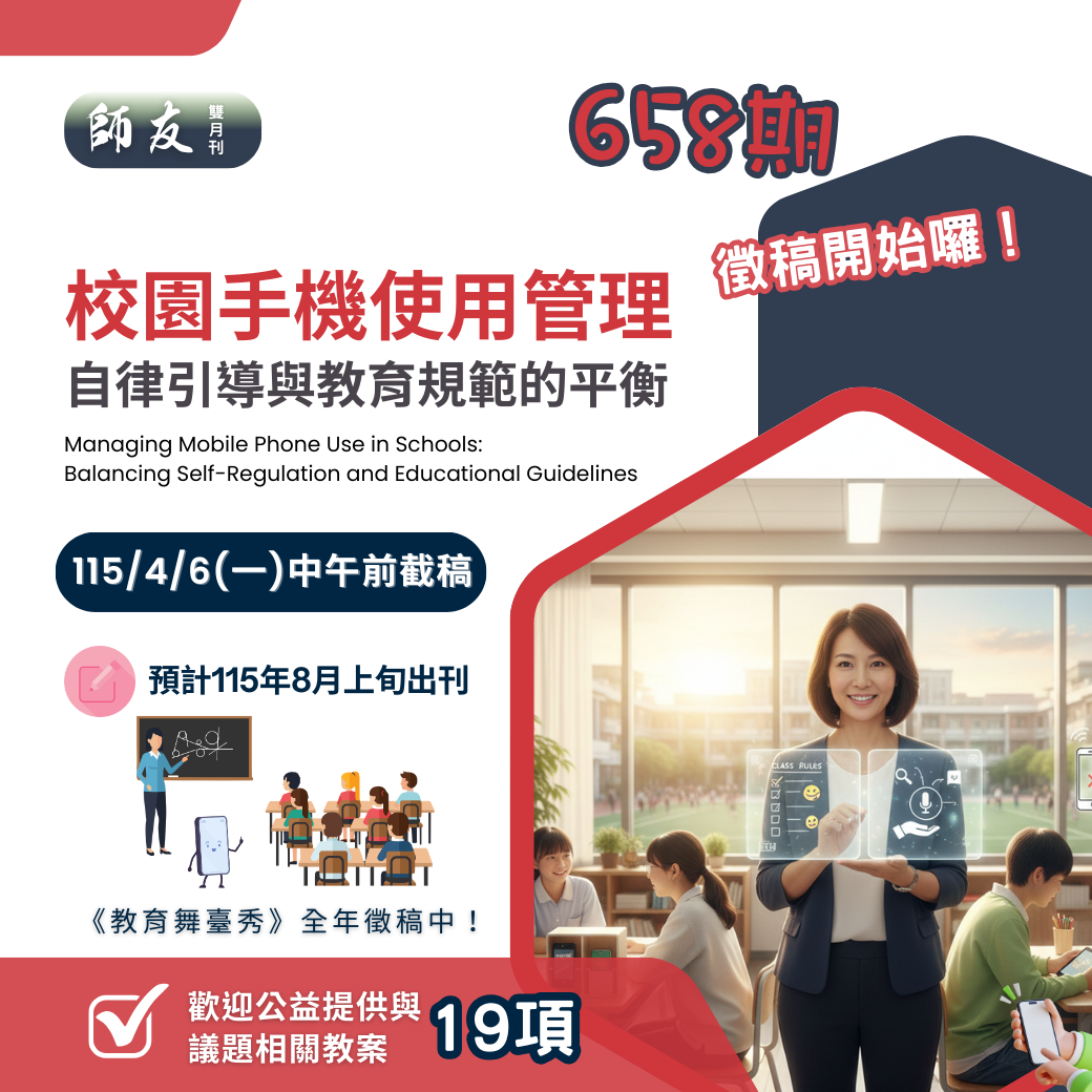 658期「班級經營——校園手機使用管理:自律、規範與教育的平衡」即日起至115年4月6日(一)中午12:00前截稿(預計於115年8月上旬出刊)