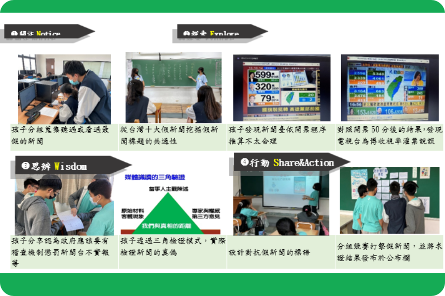 孩子分享認為政府應該要有稽查機制懲罰新聞臺不實報導。 孩子透過三角檢證模式,實際檢證新聞的真偽。 設計對抗假新聞的標語。 分組競賽打擊假新聞,並將求證結果發布於公布欄。