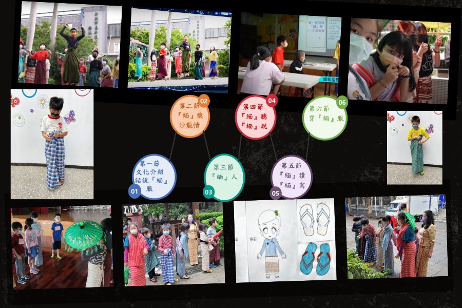 筆者的課程遵循十二年國教「新住民語文學習課程」的核心精神——語言教學與文化傳承並重。以緬甸語第六冊第二課《沙龍》為主軸,規劃了一系列以學生為主體的學習活動。課程目標不僅涵蓋文本句子的聽說讀、詞彙習得與句型應用,以及母音、子音和基礎拼音的認識,同時深入介紹緬甸的傳統服飾、配件與禮儀。在跨文化理解的層面上,課程引導學生歸納東南亞各國穿沙龍的共同文化因素,並辨別各國沙龍穿法、禁忌及服裝禮儀上的細微差異。透過這些文化比較,學生能具體感知並理解文化多樣性和差異性。